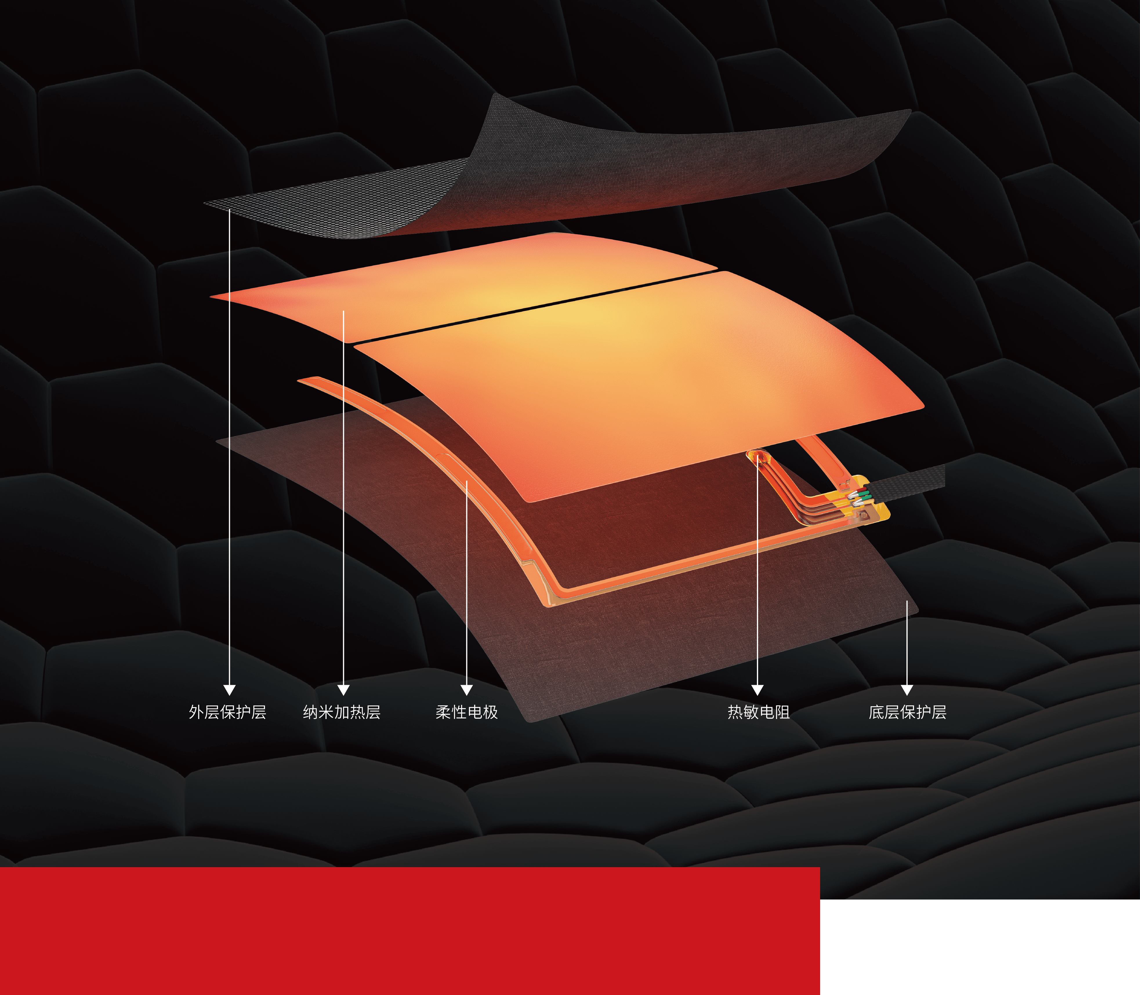 JERNANO专利「热」科技——碳纳米管薄膜,具备优异的电热特性,轻薄、柔软、耐弯折、性能稳定、支持水洗,是加热技术的理想材料。据此特性,开发出了碳纳米管薄膜柔性加热系统,可广泛应用在服装穿戴、家居理疗、智能出行等领域中。